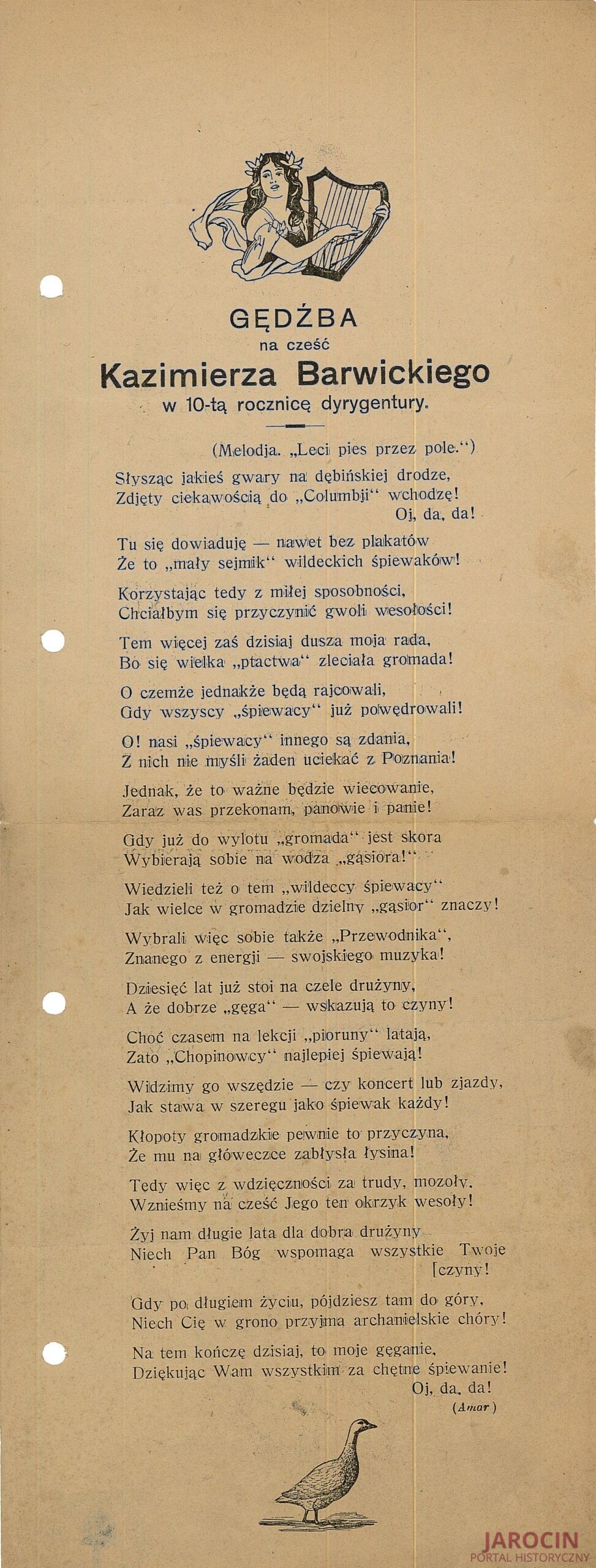 Rok 2026 to 135. rocznica zebrania założycielskiego chóru, a także 155. rocznica urodzin i 95. rocznica śmierci jego pierwszego dyrygenta. Kazimierz Tomasz Barwicki urodził się 29.12.1871 r. w Witaszycach jako syn stolarza Jana Barwickiego i Klementyny z Przyborskich18. Około 1879 r. rodzina Barwickich przeniosła się do Jarocina i tutaj ojciec Kazimierza zajął się budową domu i warsztatu. Kazimierz pomagał ojcu, a w 1886 r., po ukończeniu szkoły powszechnej, posiadając odpowiedni zasób wiedzy z zakresu stolarstwa, zdał egzamin na czeladnika. W 1888 r., po śmierci ojca, Kazimierz objął warsztat stolarski, a w 1889 r. zdał egzamin na mistrza stolarskiego. Pracował dalej w tym zawodzie, ale nie ograniczał się jedynie do tej działalności. Niespokojny duch, wielka energia i chęć działania nie pozwala mu siedzieć bezczynnie. Organizuje przedstawienia amatorskie, a zamiłowanie do śpiewu nakazuje mu wybierać takie sztuki, w których byłoby najwięcej śpiewu. Wtedy to zaczyna dobierać na swych pomocników w warsztacie jedynie takich ludzi, którzy umieli śpiewać19. Mimo różnych problemów kontynuował działalność śpiewaczą i wielokrotnie rozpisywał własnoręcznie potrzebne nuty na chór męski. Z tych czasów zachowały się 4 książeczki głównie w czerwonej oprawie (twardej) o rozmiarach ok. 20 x 15 cm. Na pierwszej pustej kartce znajduje się pozioma owalna pieczątka z napisem: Koło Śpiewackie w Jarocinie. W środku pieczątki znajduje się wizerunek liry20. Ostatnia pieśń jest odbita hektografem21. Oznacza to, że istniało więcej kopii tej pieśni, i że wykonał je też najprawdopodobniej Barwicki.